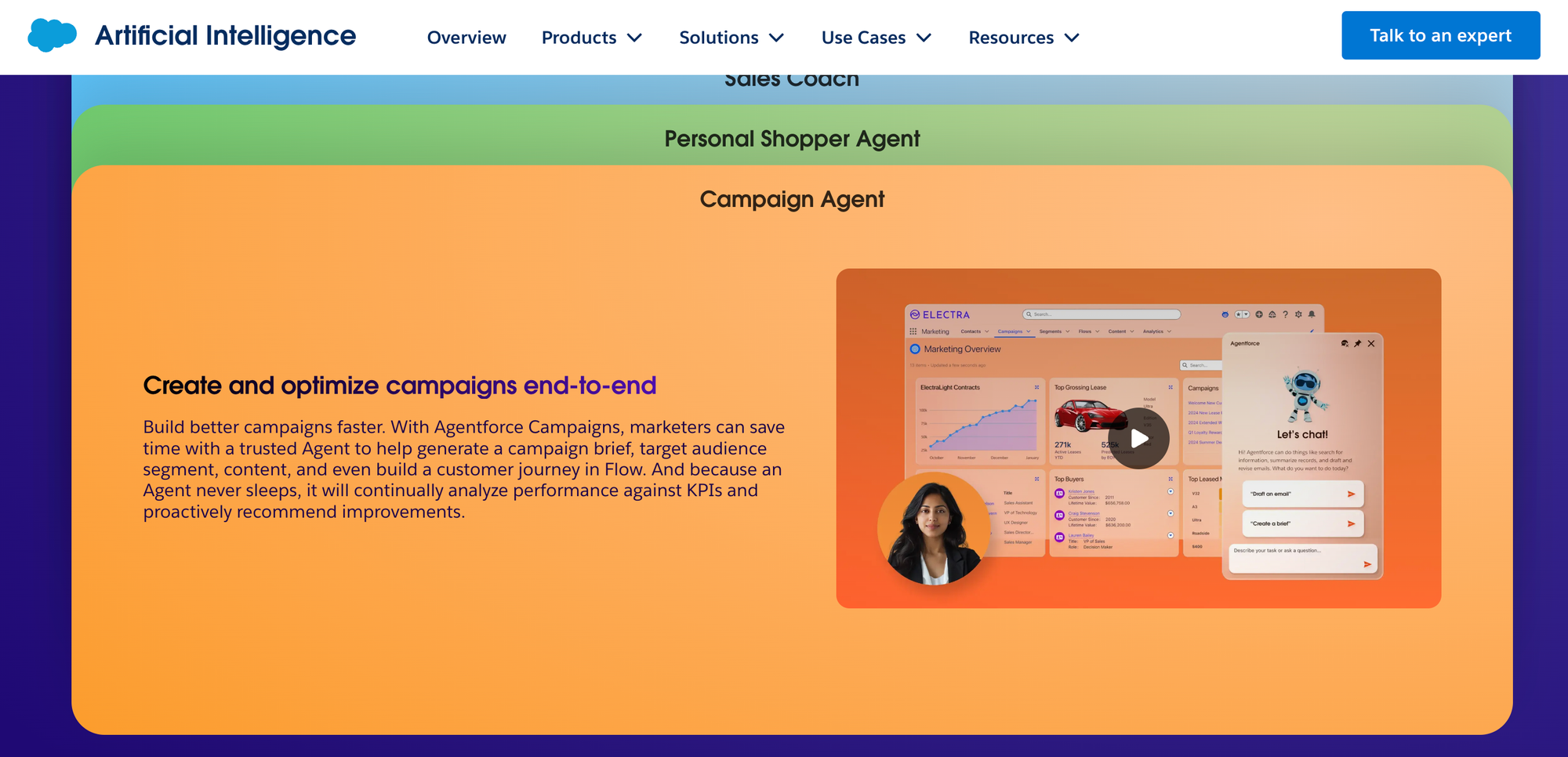 You can see how Salesforce have positioned their Campaign Agent to reflect this value proposition, “because an Agent never sleeps, it will continually analyse performance against KPIs and proactively recommend improvements.”